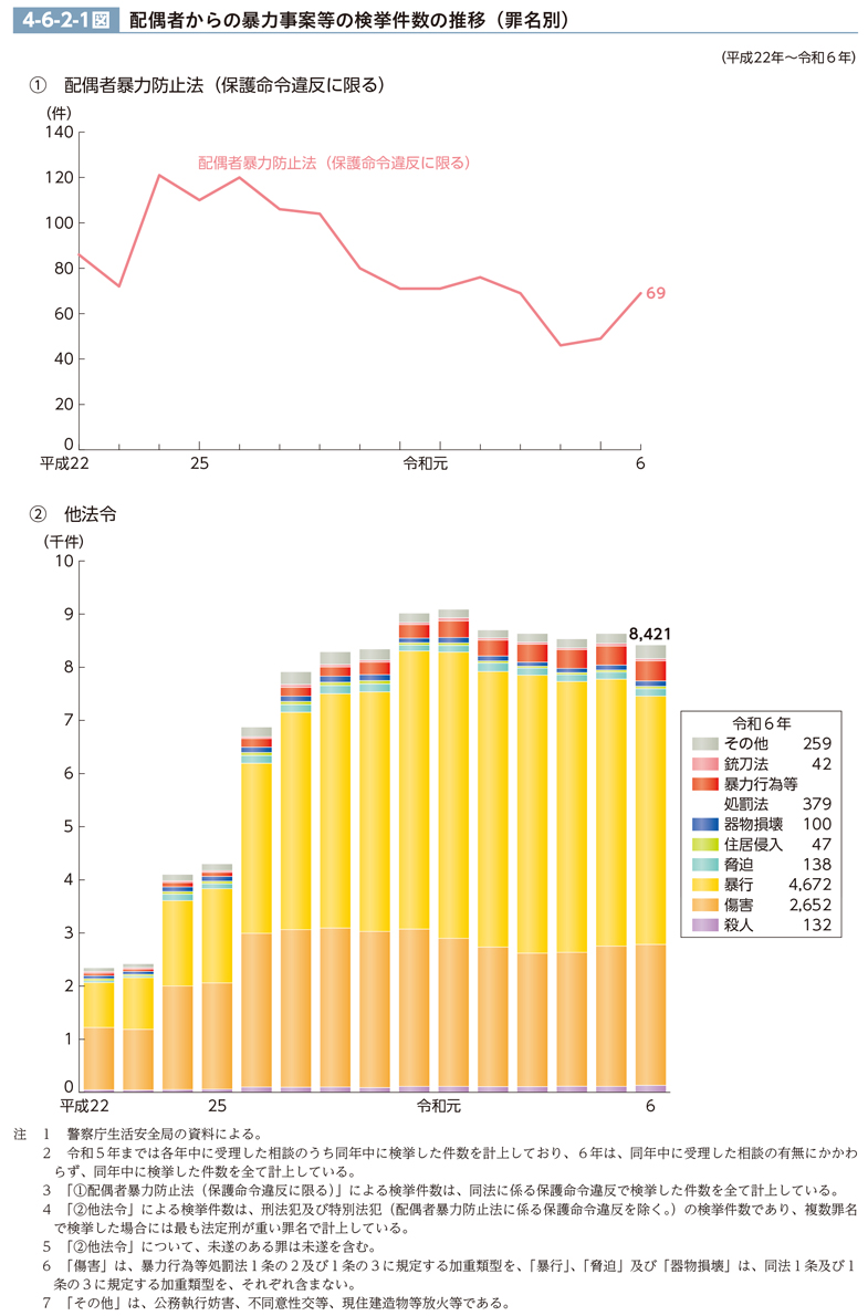 配偶者からの暴力事案等の検挙件数の推移(平成22年以降)は、4-6-2-1図のとおりである。配偶者暴力防止法に係る保護命令違反の検挙件数は、27年以降減少傾向にあったが、令和6年は増加し、69件(前年比20件増)であった。その一方、刑法等の他法令による検挙件数の総数は、平成23年以降増加しており、近年は高止まりの状態にある。令和6年は8,421件(同215件減)であり、平成22年の約3.6倍であった。罪名別では、特に、暴行及び傷害の検挙件数が大きく増加している。また、令和6年における不同意性交等の検挙件数は、24件(同12件増)であった(警察庁生活安全局の資料による。)。