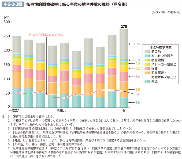 私事性的画像被害に係る事案は、私事性的画像被害防止法違反で処罰されるほか、脅迫、強要等の刑法その他の法律上の犯罪に該当する場合は、それらによっても処罰されることになる。平成27年以降の私事性的画像被害に係る事案の検挙件数の推移を罪名別に見ると、4-6-3-3図のとおりである。
