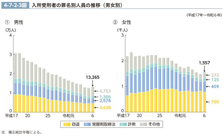 入所受刑者の罪名別人員の推移(最近20年間)を男女別に見ると、4-7-2-3図のとおりである。入所受刑者総数は、男性では、平成18年の3万699人をピークに翌年から減少し続けていたが、令和6年は1万3,265人(前年比666人(5.3%)増)であった。他方、女性では、平成18年の2,333人をピークに翌年からおおむね横ばいで推移した後、28年からは減少傾向にあったが、令和6年は1,557人(同71人(4.8%)増)であった。入所受刑者の人員を比較すると、平成元年以降、女性は、男性よりも一貫して少ない(女性比については、CD-ROM参照)。入所受刑者総数に占める窃盗及び覚醒剤取締法違反の人員の合計の割合は、男性では、平成元年以降一貫して6割未満にとどまっているのに対し、女性では、同年以降一貫して6割を超えており、23年以降は8割前後となっている。また、男性では、10年以降、一貫して窃盗の人員が覚醒剤取締法違反の人員を上回っているのに対し、女性では、元年から23年まで覚醒剤取締法違反の人員が最も多かったものの、24年以降、窃盗の人員が覚醒剤取締法違反の人員を上回っている(CD-ROM参照。令和6年における入所受刑者の罪名別構成比(男女別)については、2-4-2-5図参照)。