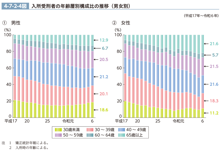 入所受刑者の年齢層別構成比の推移(最近20年間)を男女別に見ると、4-7-2-4図のとおりである。30歳未満の構成比は、男性では、低下傾向にあったものの、令和2年以降は緩やかな上昇傾向にあり、女性では、平成12年以降低下傾向にある。65歳以上の構成比は、男女共に上昇傾向にあるが、女性は、男性よりも総じて高く、その差は拡大傾向にある(CD-ROM参照)。
