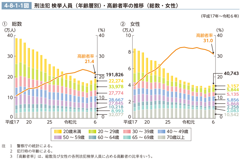 高齢者の検挙人員は、平成20年(4万8,786人)をピークとして高止まりの状況が続いた後、28年以降減少傾向にあり、令和6年は4万1,070人(前年比0.1%減)であった。高齢者率について見ると、他の年齢層の検挙人員の減少傾向が高齢者層と比べて大きいことから、平成28年以降も上昇傾向にあったが、令和4年から3年連続で低下しており、6年は、他の年齢層の検挙人員が増加(同6.0%増)したことから、前年と比べて1.0pt低下し、21.4%であった。