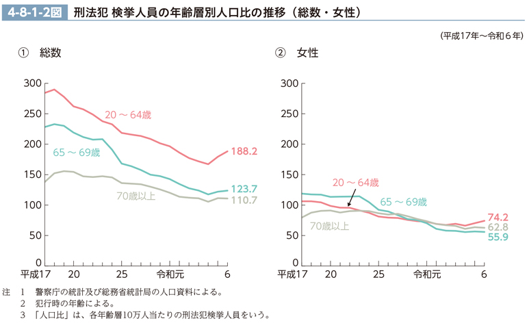 平成23年以降、高齢者の検挙人員のうち70歳以上は65%以上を占めているが(1-1-1-5図CD-ROM参照)、人口比では一貫して65~69歳を下回っており、令和6年は110.7(前年比0.6低下)であった。一方、70歳以上の女性の検挙人員は、平成17年以降女性高齢者の検挙人員の65%以上を占め(1-1-1-5図CD-ROM参照)、人口比でも27年以降65~69歳を上回っており、令和6年は62.8(同0.8低下)であった。