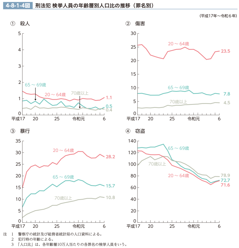 殺人、傷害及び暴行について見ると、人口比は20~64歳、65~69歳、70歳以上の順で高い傾向にあるが、窃盗について見ると、人口比は平成26年以降一貫して70歳以上が最も高い。