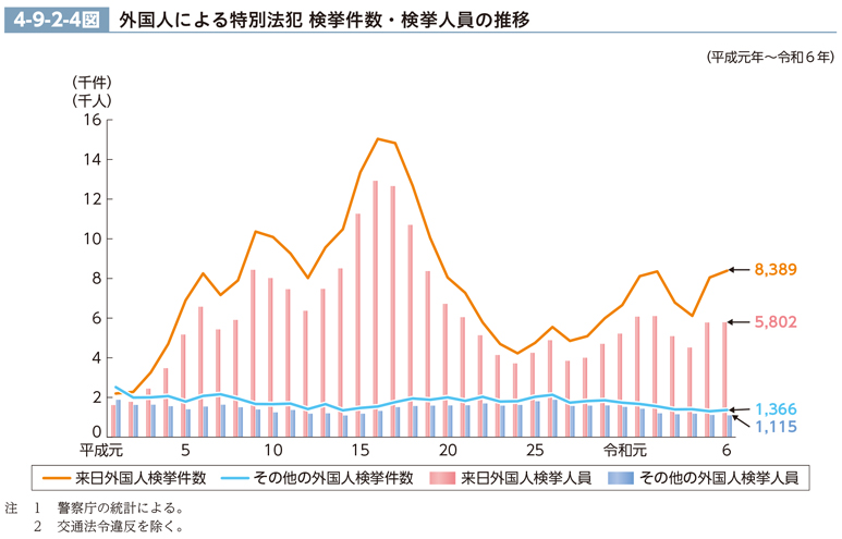 4-9-2-4図は、外国人による特別法犯(交通法令違反を除く。以下この項において同じ。)の検挙件数及び検挙人員の推移(平成元年以降)を、来日外国人とその他の外国人の別に見たものである。来日外国人による特別法犯の検挙件数及び検挙人員は、いずれも、16年をピークに24年まで減少した後、25年からの増減を経て、令和5年から2年連続で増加し、6年は検挙件数8,389件(前年比4.2%増)、検挙人員5,802人(同0.1%増)であった。