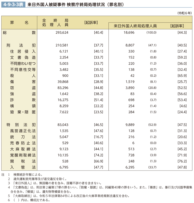 令和6年における来日外国人被疑事件の検察庁終局処理状況を罪名別に見ると、4-9-3-3表のとおりである。来日外国人の起訴率は、日本人を含めた全終局処理人員と比較すると、刑法犯では2.8pt、特別法犯では1.0pt、入管法違反を除いた特別法犯では0.6pt高い(CD-ROM資料2-2及び4-7参照)。