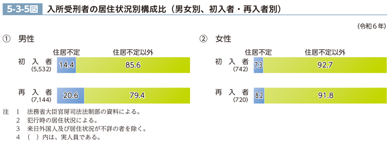 5-3-5図は、令和6年における入所受刑者の居住状況別構成比を男女別に見るとともに、これを初入者・再入者別に見たものである。