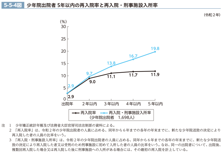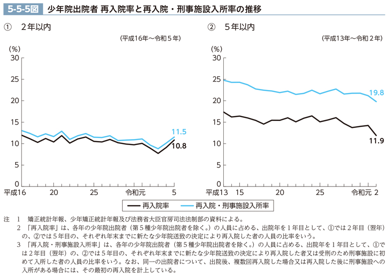 この項では、少年院出院者の再入院又は刑事施設への入所の状況について概観する。ここで、再入院率とは、各年の少年院出院者人員のうち、一定の期間内に、新たな少年院送致の決定により再入院した者の人員の比率をいい、再入院・刑事施設入所率とは、各年の少年院出院者人員のうち、一定の期間内に、新たな少年院送致の決定により再入院した者と初入者として刑事施設に入所した者の合計人員の比率をいう(以下この項において同じ。)。例えば、2年以内再入院・刑事施設入所率とは、各年の少年院出院者人員のうち、出院年を1年目として、2年目、すなわち翌年の年末までに再入院した者又は初入者として刑事施設に入所した者の人員の比率をいい、このうち再入院した者に限ったものを2年以内再入院率という。なお、同一の出院者について、出院後、複数回再入院した場合又は再入院した後に刑事施設への入所がある場合には、その最初の再入院を計上している。