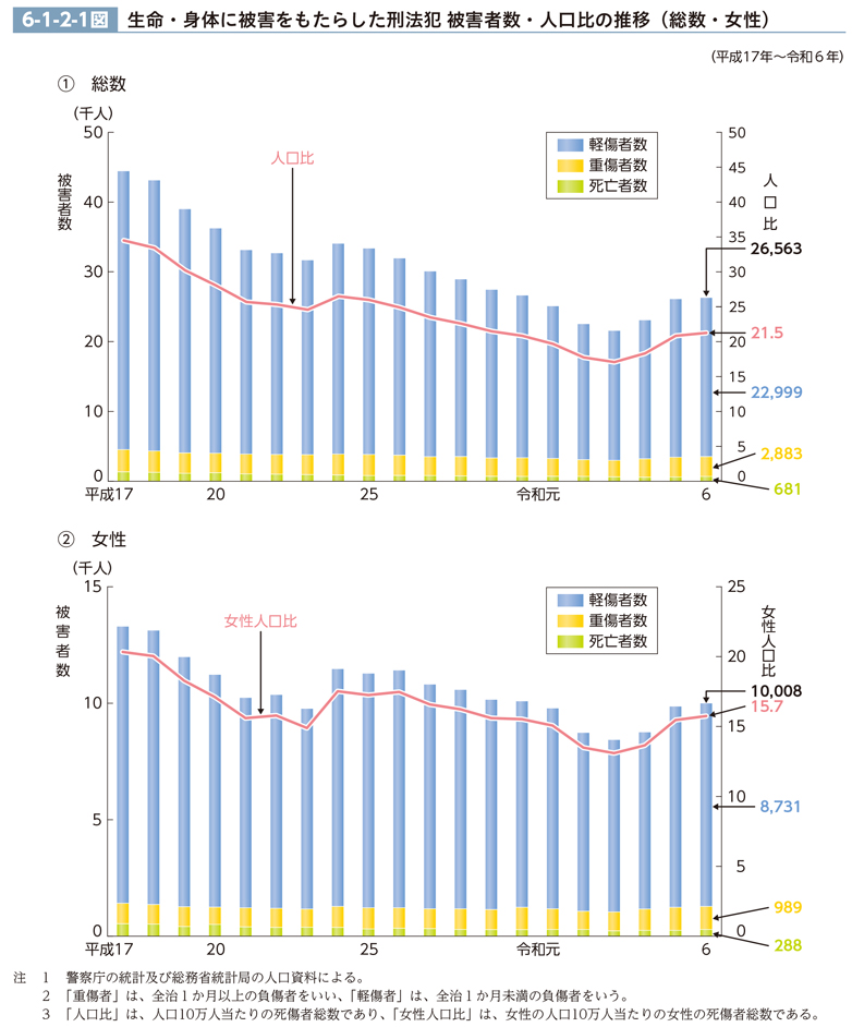 6-1-2-1図は、生命・身体に被害をもたらした刑法犯について、被害者(死傷者)の人員及び人口比の推移(最近20年間)を見たものである。死傷者総数は平成17年(4万4,465人)から減少傾向にあったが、令和4年から3年連続で増加し、6年は2万6,563人(前年比414人(1.6%)増)であった。死傷者総数に占める女性の比率は、上昇傾向にあり、6年は37.7%(平成17年比7.8pt上昇)であった(CD-ROM参照)。
