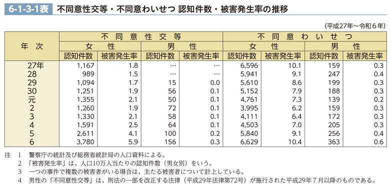 6-1-3-1表 不同意性交等・不同意わいせつ 認知件数・被害発生率の推移