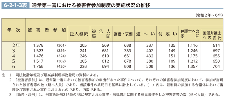 通常第一審における被害者参加制度の実施状況の推移(最近5年間)は、6-2-1-3表のとおりである。令和6年における同制度の実施状況の罪名別構成比については、7-3-1-5図参照。