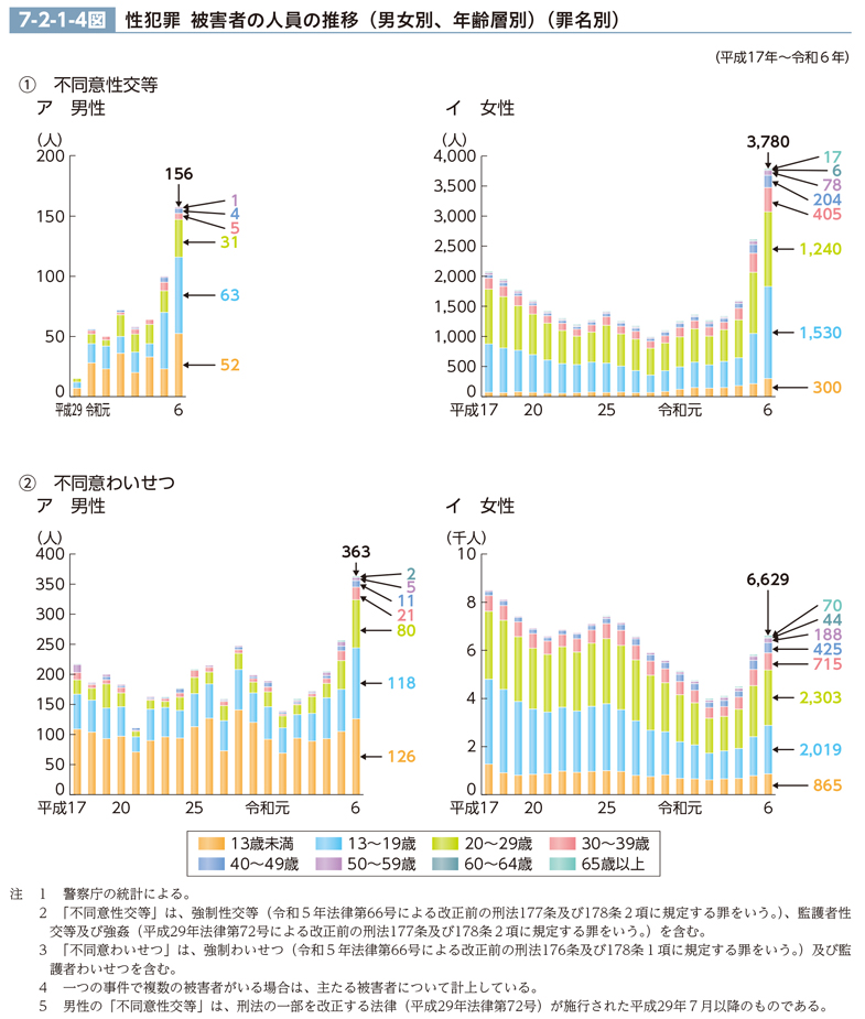 不同意性交等について、被害者の年齢層別の人員の推移(最近20年間。ただし、男性を被害者とする不同意性交等は、平成29年法律第72号による法改正が施行された平成29年7月以降)を男女別に見ると、7-2-1-4図<1>のとおりである。男性では、29年から令和4年までは、他の各年齢と比べて13歳未満(7~36人)が最も多かったが、5年以降は13~19歳(40人台から60人台)が最も多かった。女性では、平成17年以降おおむね一貫して、20~29歳(約450人から約1,000人)が最も多く、次いで13~19歳(200人台から800人台)が多かったが、令和6年は、13~19歳が大幅に増加(前年比697人(83.7%)増)し、20~29歳の1,240人(同223人(21.9%)増)を上回った。また、6年は、平成17年と比べて、おおむねいずれの年齢層も増加しているが、特に13歳未満及び40~49歳がそれぞれ約4倍と、増加幅が大きかった。