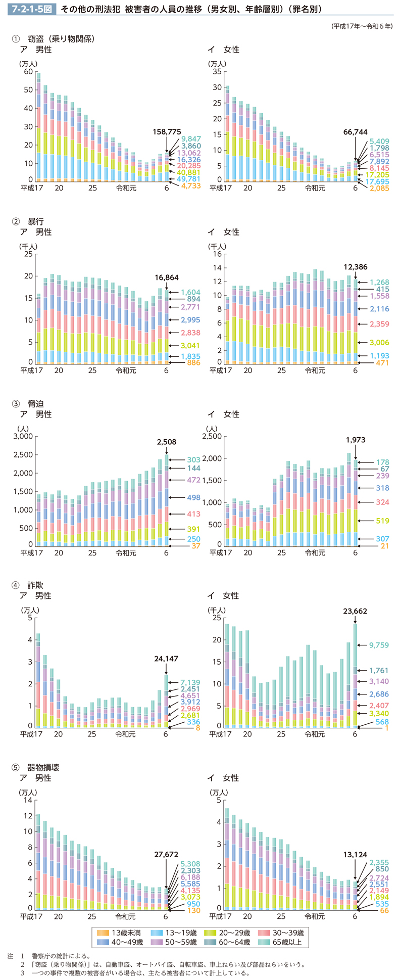 暴行について、被害者の年齢層別の人員の推移(最近20年間)を男女別に見ると、7-2-1-5図<2>のとおりである。男女共に、平成17年以降おおむね一貫して20~29歳が最も多いところ、男性は、19年(5,115人)をピークに減少傾向を示した後、28年以降は2,000人台から3,000人台で推移しているのに対し、女性は、17年以降一貫して3,000人台で推移している。また、男性では、20年から令和3年までは、13~19歳、20~29歳及び30~39歳が減少傾向にあったのに対し、65歳以上は、平成18年以降増加傾向にあり、令和6年は、平成17年(677人)と比べて、65歳以上が約2.4倍であった。女性では、19年から令和3年までは、13~19歳が減少傾向にあったのに対し、40~49歳、50~59歳、60~64歳及び65歳以上は、平成18年以降増加傾向にあり、令和6年は、平成17年と比べて、40~49歳、50~59歳及び60~64歳がそれぞれ約2.5~3.2倍、65歳以上が約5倍であった。