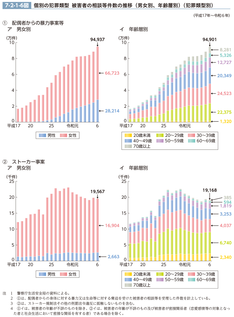 配偶者からの暴力事案等について、被害者の相談等件数の推移(最近20年間)を男女別、年齢層別に見ると、7-2-1-6図<1>のとおりである。男性は、平成19年以降増加し続けており、令和6年は、平成17年(407件)と比べて、約69倍であった。女性は、18年から令和元年まで増加し続け、6万4,392件を記録した後、高止まり傾向にあるところ、6年は平成17年(1万6,481件)の約4倍であった。年齢層別では、18年以降、全ての年齢層で増加傾向にあるところ、令和6年は、平成17年と比べて、70歳以上を除く年齢層ではそれぞれ約4~7倍、70歳以上では約21倍に増加している。