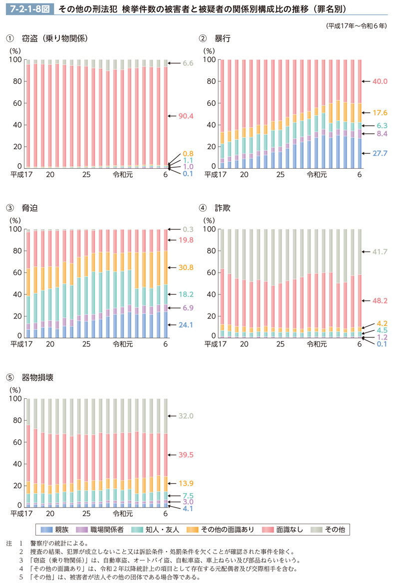 暴行について、検挙件数の構成比の推移(最近20年間)を、被害者と被疑者の関係別に見ると、7-2-1-8図<2>のとおりである。親族の構成比は平成18年以降、その他の面識ありの構成比は令和2年以降、それぞれ上昇傾向にあるところ、特に親族の構成比は、その上昇傾向が顕著であり、平成17年にはわずか5%程度であったが、令和6年には約3割まで上昇した。なお、同年について、親族の内訳(被疑者との関係における被害者の立場をいう。)を見ると、配偶者(内縁を含む。)(53.3%)、実子・養子(21.4%)、実父母・養父母(13.5%)の順で高かった(6-1-5-1図CD-ROM参照)。他方、面識なしの構成比は、平成17年には約7割であったが、令和6年には約4割へ低下している。