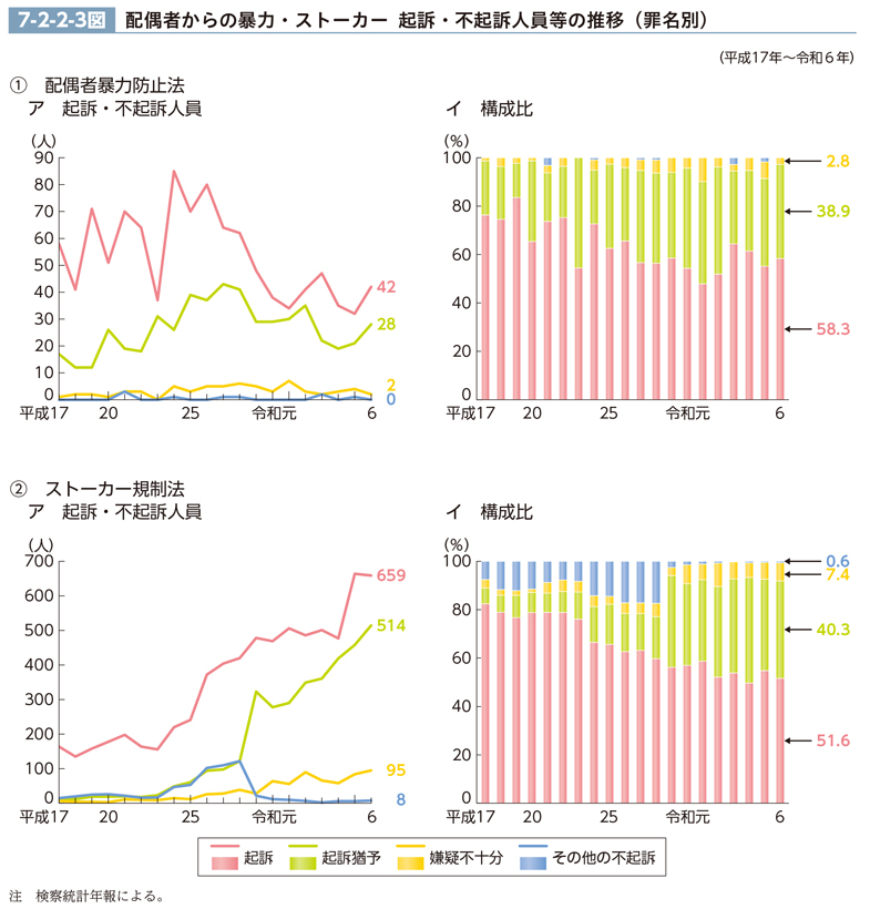 配偶者暴力防止法違反及びストーカー規制法違反の起訴・不起訴人員等の推移を見るに当たっては、<1>平成16年法律第64号による配偶者暴力防止法の改正(平成16年12月施行)により、配偶者からの暴力の定義が拡大し、保護命令制度が拡充されたこと及び令和5年法律第30号による改正(令和6年4月全面施行)により、保護命令制度が拡充されたこと(近年の法改正の詳細については、第4編第6章第2節参照)、<2>平成25年法律第73号によるストーカー規制法の改正(平成25年10月全面施行)、平成28年法律第102号による改正(29年6月全面施行)及び令和3年法律第45号による改正(令和3年8月全面施行)により、それぞれ規制対象行為が拡大されたこと並びに平成28年法律第102号による改正により、ストーカー行為罪が非親告罪とされたことに留意が必要である。
