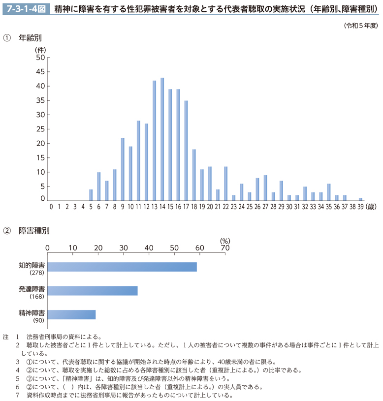 前記2で紹介した司法面接的手法を用いた代表者聴取の取組は、児童が被害者又は参考人である事件において行われてきたものであるが、検察・警察では、政府による性犯罪・性暴力対策の強化の方針を踏まえ、性犯罪被害者に対する事情聴取の在り方をその供述の特性や心情等により配慮したものとするため、令和3年4月から、知的障害等の精神に障害を有する被害者に係る性犯罪事件においても、司法面接的手法を用いた代表者聴取を試行している。この試行の対象となる精神に障害を有する性犯罪被害者については、18歳未満の者と18歳以上の者の双方を含み、当該事件の内容、証拠関係、被害者の障害の程度等を考慮し、その負担軽減及び供述の信用性確保の観点から、代表者聴取を行うことが相当であると認められる事件について、司法面接的手法を用いた代表者聴取を行っている。同月当時は、東京地方検察庁等の一部の試行庁(13庁)でこの試行を実施してきたところ、4年7月からは、試行庁が全ての地方検察庁に拡大されている。