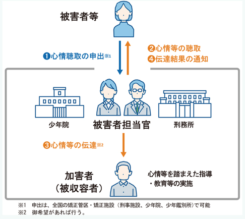 本制度は、申出のあった被害者等の心情等を聴取し、被害者等が希望する場合にはその心情等を加害者である被収容者に伝達するとともに、矯正処遇等に活かしていくものである。本制度の導入に伴い、全国の刑事施設及び少年院では、受付から伝達までの各事務を中心となって行う「被害者担当官」を指名している。