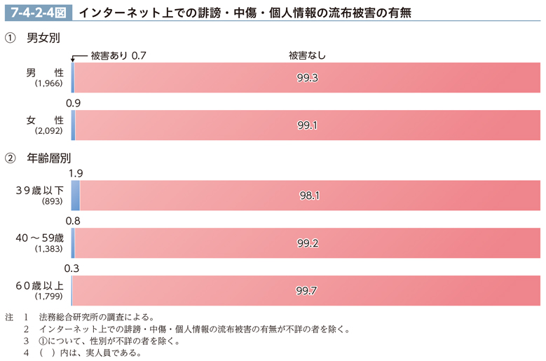 過去5年間に、インターネット上で誹謗・中傷・個人情報の流布被害を受けた者は、33人(0.8%)であった。一番最近の被害の内容は、「誰でも見られるサイト・アプリで誹謗・中傷を受けた」が22人(66.7%)、「誰でも見られるサイト・アプリに個人情報を載せられた」が6人(18.2%)、「特定のグループの人が見られるサイト・アプリで誹謗・中傷を受けた」が2人(6.1%)、「特定のグループの人が見られるサイト・アプリに個人情報を載せられた」、「他の人からは見られないメール・メッセージなどで誹謗・中傷を受けた」及び「分からない」が各1人(3.0%)であった。