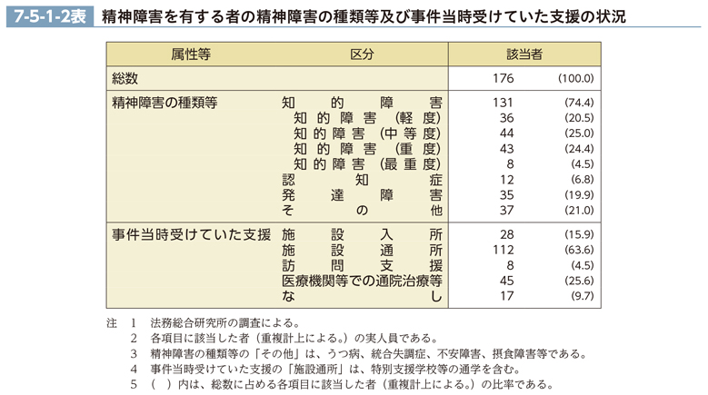 調査対象被害者のうち精神障害を有する者について、精神障害の種類等及び事件当時受けていた支援の状況を見ると、7-5-1-2表のとおりである。精神障害の種類等について、該当率(重複計上による。)を見ると、調査対象被害者の7割以上が「知的障害」に該当し、2割程度が「発達障害」に該当した。知的障害の程度別では、「知的障害(中等度)」と「知的障害(重度)」が同程度に高かった。事件当時受けていた支援の状況について、該当率(重複計上による。)を見ると、「施設通所」が60%を超えて最も高く、「医療機関等での通院治療等」が約26%、「施設入所」が約16%であった。