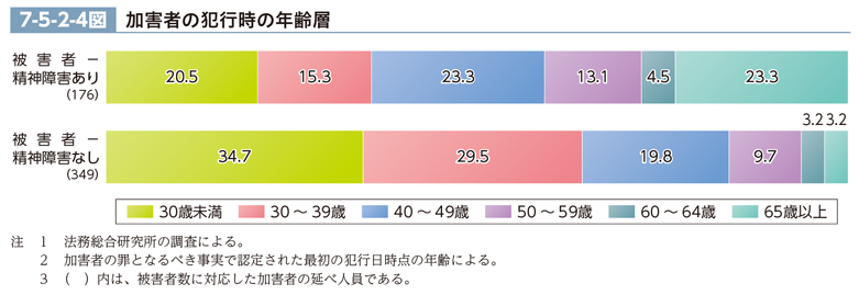 この項では、調査対象事件において、被害者の精神障害の有無により、加害者の属性等の傾向・特徴に違いがあるかについて見る。なお、加害者の人員は、被害者数に対応した延べ人員であること、すなわち、一人の加害者について、複数の異なる調査対象被害者に対する事件がある場合は、被害者ごとに加害者の人員を計上していることに留意が必要である(以下この項において同じ。)。