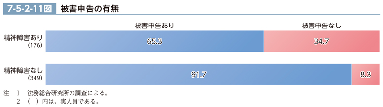 調査対象被害者による被害申告の有無について、調査対象被害者を群別に見ると、7-5-2-11図のとおりである。精神障害あり群及び精神障害なし群のいずれも、「被害申告あり」が「被害申告なし」を上回ったが、その構成比は、精神障害なし群では、9割を超えた一方、精神障害あり群では、7割を下回った。精神障害あり群は、精神障害なし群よりも「被害申告なし」の構成比が高かった。