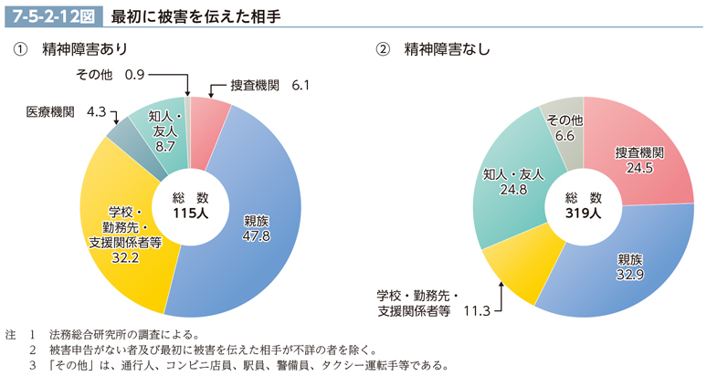 前記(5)において「被害申告あり」だった調査対象被害者について、最初に被害を伝えた相手を調査対象被害者の群別に見ると、7-5-2-12図のとおりである。精神障害あり群及び精神障害なし群のいずれも、「親族」の構成比が最も高かった。精神障害あり群では、次いで、「学校・勤務先・支援関係者等」、「知人・友人」の順であったのに対し、精神障害なし群では、次いで、「知人・友人」、「捜査機関」の順であった。精神障害あり群は、精神障害なし群よりも「親族」、「学校・勤務先・支援関係者等」及び「医療機関」の構成比が高く、「捜査機関」、「知人・友人」及び「その他」(通行人、コンビニ店員、駅員、警備員、タクシー運転手等)の構成比が低かった。なお、本調査項目は、調査者において、被害者供述等の関係各証拠を調査した結果を分類したものである。