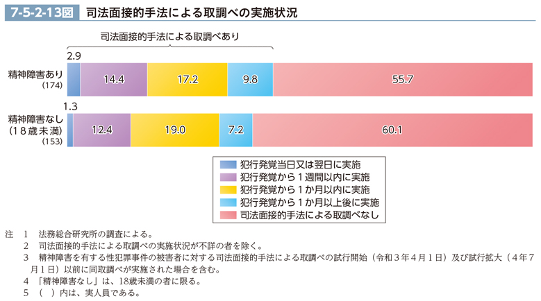 なお、精神に障害を有する性犯罪被害者を対象とした代表者聴取は、令和3年4月から東京地方検察庁等の一部の検察庁において試行が開始され、4年7月から全ての検察庁において試行が拡大されているところ(本編第3章第1節3項参照)、本特別調査の精神障害あり群については、これら試行開始・拡大以前の事件が調査対象事件として多数含まれていること及び「司法面接的手法による取調べなし」に該当した者には、そもそも精神障害の影響により供述困難なため取調べが実施されていないケースも多く含まれていることに留意が必要である。